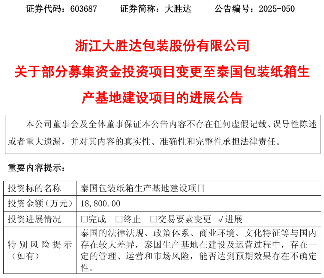 泰国近年来已成为全球制造业转移的重要目的地。东南亚纸包装市场规模已超过35亿美元,年均增长率约为6%,但市场竞争格局复杂,各国政策差异明显。与中国相比,泰国在土地、用工、通关、税收等制度方面存在较大差异,且语言、文化及法律体系的融合难度较高。大胜达在公告中特别指出,该项目"存在管理、运营及市场风险,实际效果能否达到预期存在不确定性"。