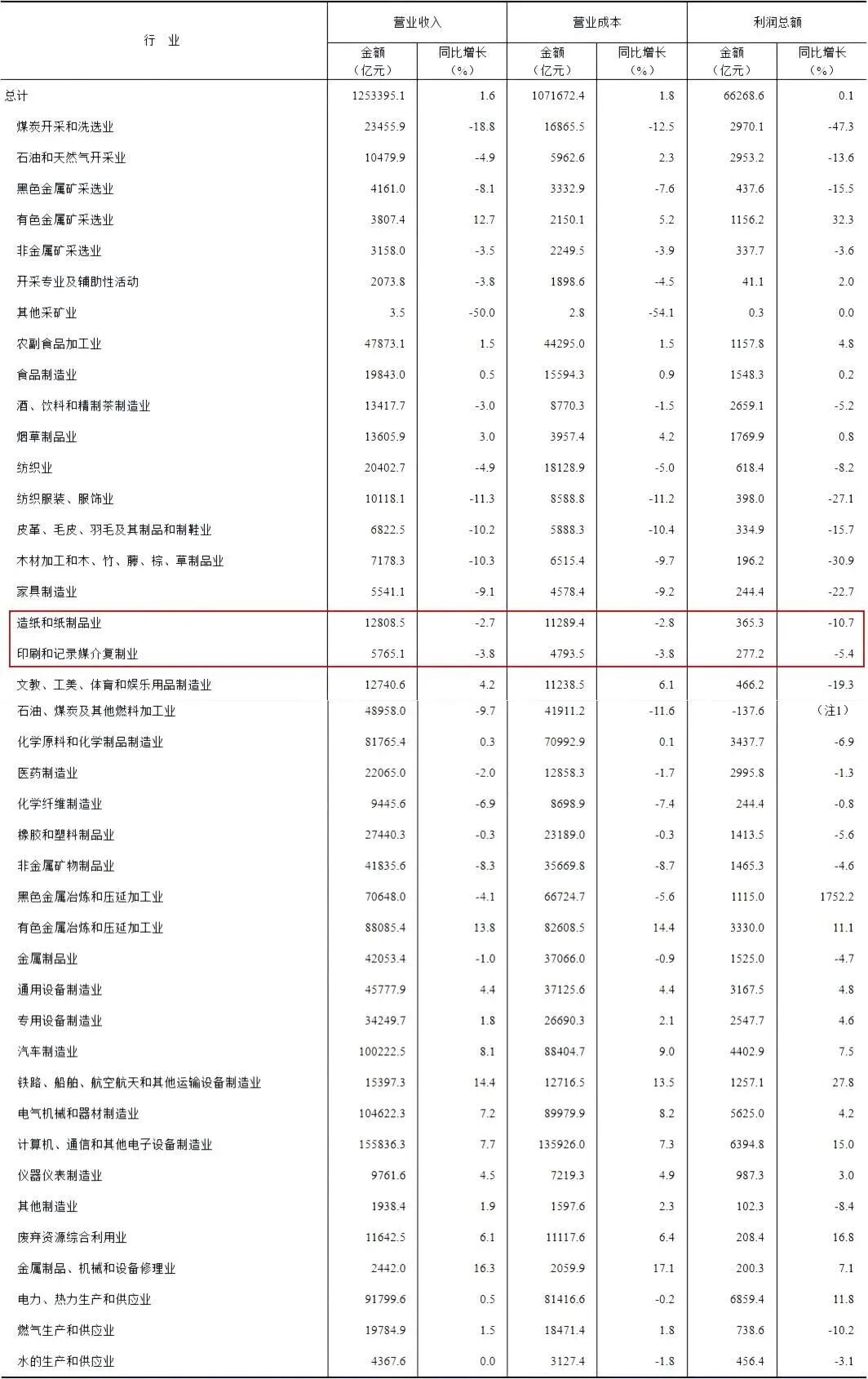 造纸和纸制品业前11月利润总额365亿 同比下降11%新闻来源: 发布时间:2025-12-31 09:40:00 12月27日,国家统计局发布了2025年1-11月份全国规模以上工业企业利润情况。 ![]() 数据显示,2025年1-11月份,全国规模以上工业企业实现利润总额66268.6亿元,同比增长0.1%。其中,造纸和纸制品业实现利润总额365.3亿元,同比下降10.7%;印刷和记录媒介复制业实现利润总额277.2亿元,同比下降5.4%。 在营业收入方面,规模以上工业企业实现营业收入125.34万亿元,同比增长1.6%。其中,造纸和纸制品业实现营业收入12808.5亿元,同比下降2.7%;印刷和记录媒介复制业实现营业收入5765.1亿元,同比下降3.8%。 ![]() 国家统计局工业司首席统计师于卫宁解读2025年1—11月份工业企业利润数据 1-11月份,规模以上工业企业利润增速有所回落,但仍然延续8月份以来的增长态势,以装备制造业、高技术制造业为代表的新动能行业保持较快增长,工业经济转型升级有序推进。 工业企业利润和营业收入保持增长。1-11月份,规模以上工业企业利润同比增长0.1%,自今年8月份以来累计增速连续四个月保持增长。从三大门类看,1-11月份,制造业增长5.0%;电力、热力、燃气及水生产和供应业增长8.4%;采矿业下降27.2%,降幅较1—10月份收窄0.6个百分点。1-11月份,规模以上工业企业营业收入同比增长1.6%。 装备制造业利润带动作用明显。1-11月份,规模以上装备制造业利润同比增长7.7%,拉动全部规模以上工业企业利润增长2.8个百分点,是对规模以上工业企业利润增长拉动作用最强的板块。从行业看,装备制造业的8个大类行业中有7个行业利润实现同比增长,其中,铁路船舶航空航天、电子行业利润两位数增长,增速分别达27.8%、15.0%;汽车行业利润增长7.5%,较1-10月份加快3.1个百分点;通用设备、专用设备、电气机械行业利润继续增长,增速分别为4.8%、4.6%、4.2%。 高技术制造业利润增速加快。1-11月份,规模以上高技术制造业利润同比增长10.0%,较1-10月份加快2.0个百分点,增速高于全部规模以上工业平均水平9.9个百分点。从行业看,“人工智能+”行动深入实施带动相关设备制造行业利润向好,电子工业专用设备制造行业利润同比增长57.4%,其中半导体器件专用设备制造、电子元器件与机电组件设备制造行业利润分别增长97.2%、46.0%;航空航天产业快速发展推动行业利润增长较快,航空、航天器及设备制造行业利润同比增长13.3%,其中航天相关设备制造、航空相关设备制造行业利润分别增长192.9%、36.3%;智能化产品助力数智化转型,智能消费设备制造行业利润同比增长54.0%,其中智能车载设备制造、智能无人飞行器制造、其他智能消费设备制造行业利润分别增长105.7%、76.6%、58.1%。 原材料制造业利润较快增长。1-11月份,规模以上原材料制造业利润增长较快,同比增速达16.6%,拉动全部规模以上工业企业利润增长2.0个百分点。从行业看,自今年以来,钢铁行业盈利状况改善明显,叠加低基数因素,行业利润同比大幅增长;在市场需求增加、营收增长较快的带动下,有色行业利润保持两位数增长。 总体看,规模以上工业企业利润延续增长态势,工业新动能的支撑作用进一步显现。但也要看到,国际环境不稳定不确定因素较多、工业新旧动能转换仍面临结构调整压力,工业企业效益恢复基础还需继续巩固。下阶段,要全面贯彻落实中央经济工作会议精神,推动传统产业改造升级,大力培育新质生产力,加快建设现代化产业体系,推动工业经济持续健康发展。 ![]() ![]() ![]() ![]() ![]() ![]() ![]() ![]() ![]() ![]() ![]() ![]() ![]() 精彩回顾 |